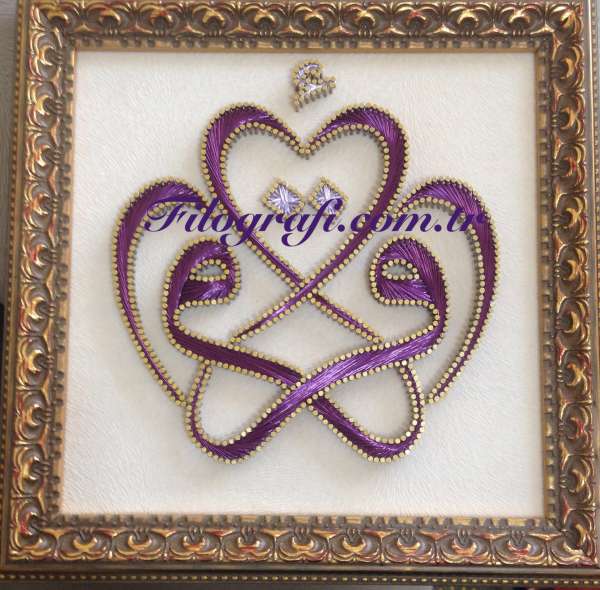 "Filografi Tablolar, Ahşap Üstüne gerilmiş kadife,taytüyü,deri vb. bir zemin üzerine çakılan çiviler arasından tellerin geçirilmesi ve belirli örgü teknikleri kullanılarak çeşitli desenlerin meydana getirildiği bir sanattır. Kullanılan özel örgü teknikleri sayesinde tablo hem 3 boyutlu bir görünüm kazanmakta hemde işlenen teller yansıyan ışıklarla çok güzel renkler vermektedir. Kullanılan teller bakır olup paslanmaz özelliktedir,kullanılan çivilerde paslanmaya karşı özel olarak boyanmaktadır." Tabloyu detaylı incelemek için resme tıklayın.